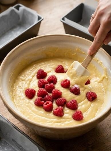 Carefully fold in the fresh raspberries so they are evenly distributed.